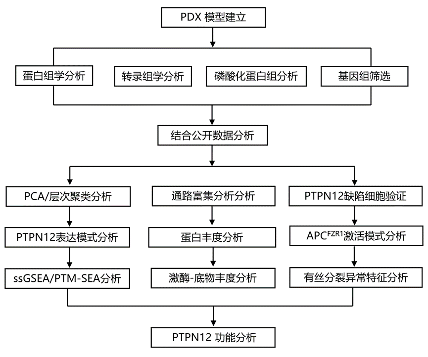 他们对一组源自14例独立TNBC患者的PDX模型进行了蛋白质组学分析,这些模型中PTPN12蛋白的表达水平和功能存在异质性。从每个PDX模型中获取三个独立的肿瘤样本,并采用全外显子组测序、转录组分析(RNA-seq)以及蛋白质和磷酸化位点的定量蛋白质组学方法进行分析(图S1A)。初步筛选后,获得了超过19000个基因和10000个不同蛋白质的拷贝数、转录本和肽段丰度数据。此外,他们还鉴定了约40000个磷酸化位点,这些位点来源于超过7000个磷酸化蛋白。在所有分析的数据类型中,生物学重复样本均高度相关,表明数据集内模型内部差异较小,模型间异质性较高,mRNA 和蛋白质之间的相关性中位数为 0.55,与先前对原发性乳腺肿瘤的蛋白质组学研究结果一致(图 S1B-C)。重要的是,使用无监督分层聚类将本研究的PDX 队列与原发性乳腺癌样本进行比较,结果表明,这些模型的基因组和转录谱能够忠实地代表基于 PAM50 分类的基底细胞亚型(图 S1D-F)。