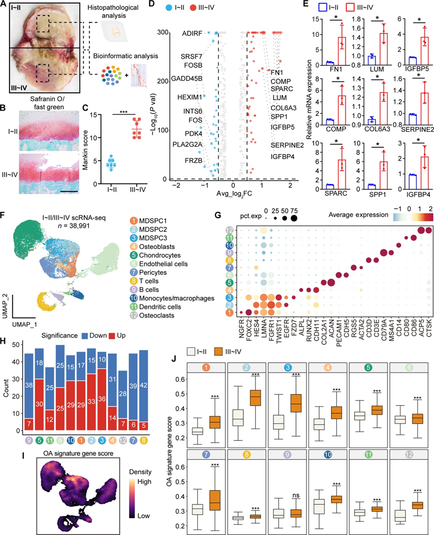 (A) 用于后续组织病理学和生物信息学分析的人 OA 样本取样区域。(B) I~II 和 III~IV 侧组织的番红 O/固绿染色。(C) 基于番红 O/固绿染色的 I~II 和 III~IV 侧组织的 Mankin 评分。(D) I~II 和 III~IV 侧组织之间的整体差异基因表达。(E) 定量聚合酶链式反应结果显示 I~II 和 III~IV 侧组织之间代表性基因表达的差异。(F) UMAP可视化。(G) 点图显示每个聚类中标记基因的表达。(H) 条形图显示每个聚类中 I~II 和 III~IV 侧组织之间的 DEG 计数。(I) 密度图显示具有高 OA 特征基因得分的区域。(J) 箱线图显示每个聚类中 I~II 和 III~IV 侧组织之间的 OA 特征基因得分。
