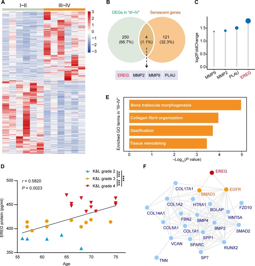 (A) 热图显示I~II侧和III~IV侧组织之间的差异表达基因。(B) 维恩图显示III~IV侧组织上调的DEG与衰老基因共同的基因。(C) III~IV侧组织上调的DEG与衰老基因共同的基因。(D) 血清中EREG的含量。(E)GO分析。(F) 蛋白质-蛋白质相互作用(PPI)网络图显示EREG与OA相关骨化基因的相互作用。