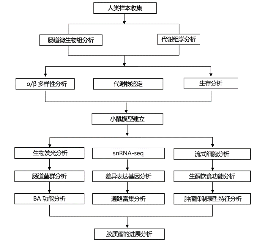 胶质瘤是脑部最常见的神经上皮肿瘤,约一半患者会发展为胶质母细胞瘤(GBM),这是最具破坏性的肿瘤类型。目前,GBM的治疗效果仍然有限,中位总生存期仅为15个月。鉴于预后如此糟糕,迫切需要开发新的治疗方法。近年来,以肠道菌群为靶点的疗法正逐渐成为个体化癌症治疗的新范式。研究表明,胶质瘤患者和健康对照组(HC)的肠道菌群结构存在显著差异。抗生素(ABX)诱导的肠道菌群耗竭会加剧临床前模型中胶质瘤的生长。然而,胶质瘤患者肠道菌群的确切特征,尤其是核心菌群,仍然是未知的。重要的是,肠道菌群如何影响神经胶质瘤生长的机制基础尚未阐明。