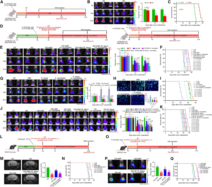 (A, D)小鼠模型建立。(B, E, G, J) 生物发光成像和肿瘤定量分析。(C, F, I, K) 对接受指定治疗的 C57BL/6J 和 NOD-SCID 小鼠进行生存分析。(H) 免疫荧光染色和定量分析。(L-O) LVRshp53 和 SPF/GF 小鼠的治疗方案。(M) 肿瘤的定量分析。(N, Q) 生存分析。(P) 生物发光图像和肿瘤定量。